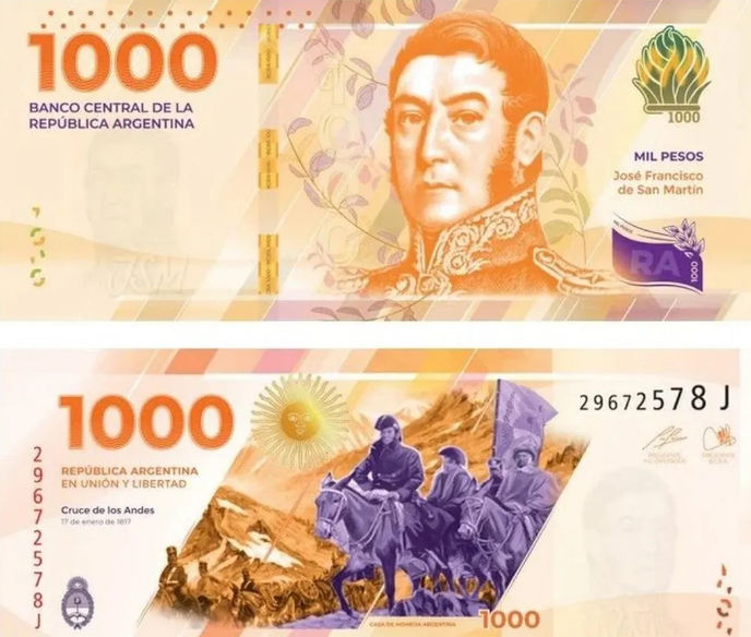 El nuevo billete de 1000 pesos, con la imagen de San Martín mantendría los tonos naranjas que tiene el del hornero y también su tamaño.