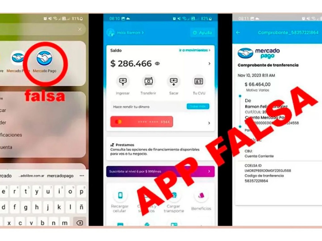 En esta nueva modalidad, el estafador hace una compra, a la hora de pagar le avisa al vendedor que va a pagar con Mercado Pago, tipea un alias o CBU y el importe. Luego le muestra al comerciante su celular con una pantalla muy similar a la de la aplicación, con el importe correcto y se va. Pero el dinero no llega nunca.