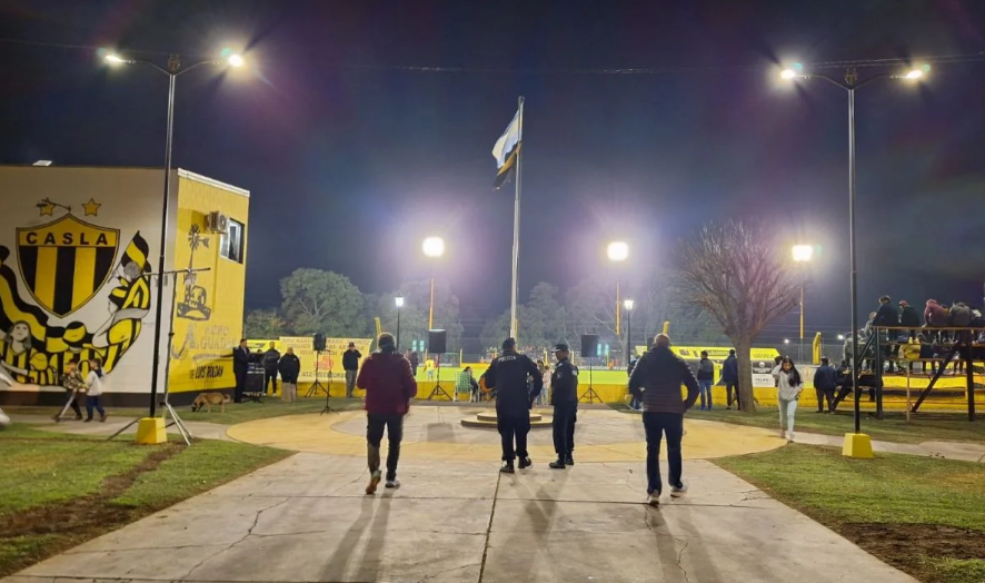Por otra parte, las autoridades presentes acompañaron al Pte. del Club Gastón Michlig y a todos los miembros de la Comisión directiva en la inauguración de 10 columnas -en el sector de ingreso- con luces led de 150 Watts, donadas por la empresa Argelec; las nuevas tribunas construidas en el sector visitante, para 200 personas, y la presentación del renovado campo de juego, que lució impecable con el sembrado de invierno.