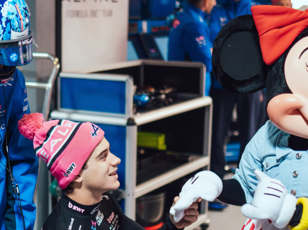 Durante la jornada, el argentino tuvp tiempo para la distracción antes de subirse al A525: aprovechó para repartirle alfajores a los miembros de la escudería y también apareció en una foto junto a Minnie, la novia de Mickey Mouse, en el país donde nació uno de los dibujos animados más reconocidos de la historia.