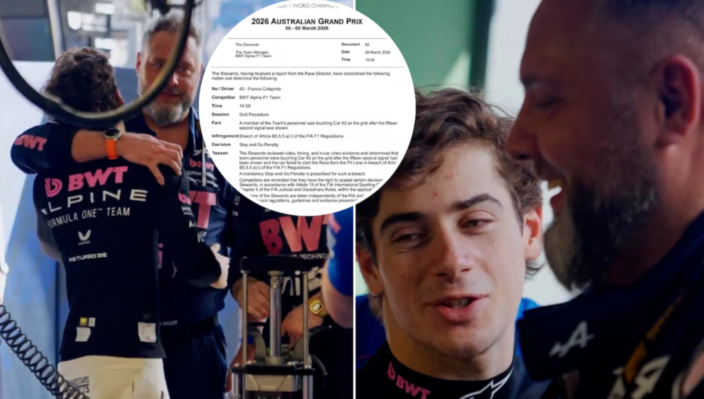 La jornada se complicó para Colapinto incluso antes de iniciar la carrera en el circuito de Albert Park. Mientras el piloto se encontraba preparado para la vuelta de formación, un mecánico de Alpine tocó el monoplaza número 43 en el momento en que el reglamento prohibía cualquier intervención sobre los vehículos en la grilla. La maniobra, aparentemente inadvertida por el equipo, fue detectada por los comisarios deportivos de la FIA, quienes procedieron a aplicar la sanción establecida en el Artículo B5.5.5 a) i) del Reglamento Deportivo de la F1.