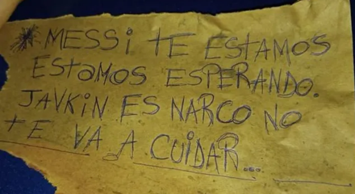 "Messi, te estamos esperando, (Pablo) Javkin es narco y no te va a cuidar", rezaba el cartel que dejaron los atacantes, alrededor de las 3, en el frente del local ubicado en Lavalle 2554, en referencia al intendente de Rosario.