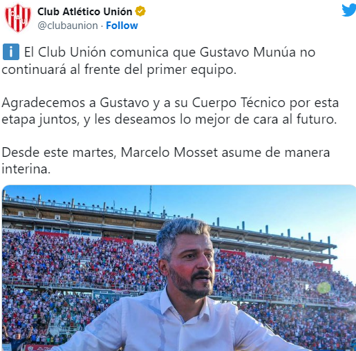 "El Club Unión comunica que Gustavo Munúa no continuará al frente del primer equipo. Agradecemos a Gustavo y a su Cuerpo Técnico por esta etapa juntos, y les deseamos lo mejor de cara al futuro. Desde este martes, Marcelo Mosset asume de manera interina", expresa el comunicado en redes sociales.