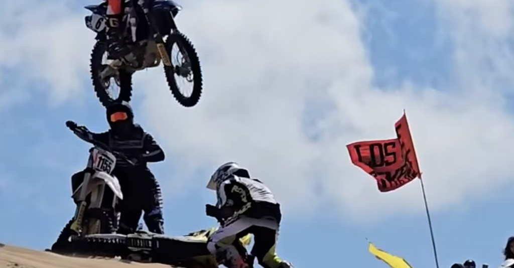 Inmediatamente, en medio de esa escena de desesperación, otro participante saltó por el lugar e impactó en uno de los competidores, casi sin advertir lo sucedido. Una toma que registró el usuario de Instagram “El Chimi” (@mandale_chimi) mostró que la motocicleta que impacta es la número 6. Rápidamente, dos personas se pusieron en el punto más alto de la duna para gesticular con el fin de evitar el tránsito por ese lugar, al mismo tiempo que los banderilleros desde los extremos agitaban la bandera amarilla para advertir a los distintos participantes.